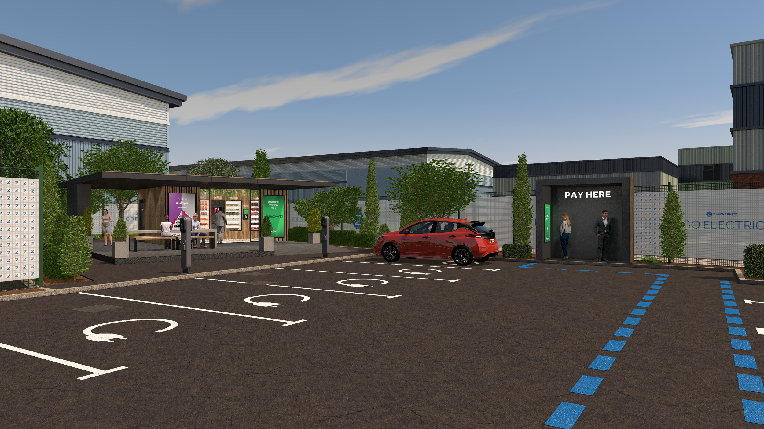 Designed with user experience in mind, the layout includes comfortable waiting areas with green landscaping and seating, creating a welcoming space for users. This concept not only supports the growing demand for electric vehicles but also promotes a sustainable lifestyle, making it a beacon for eco-conscious drivers.