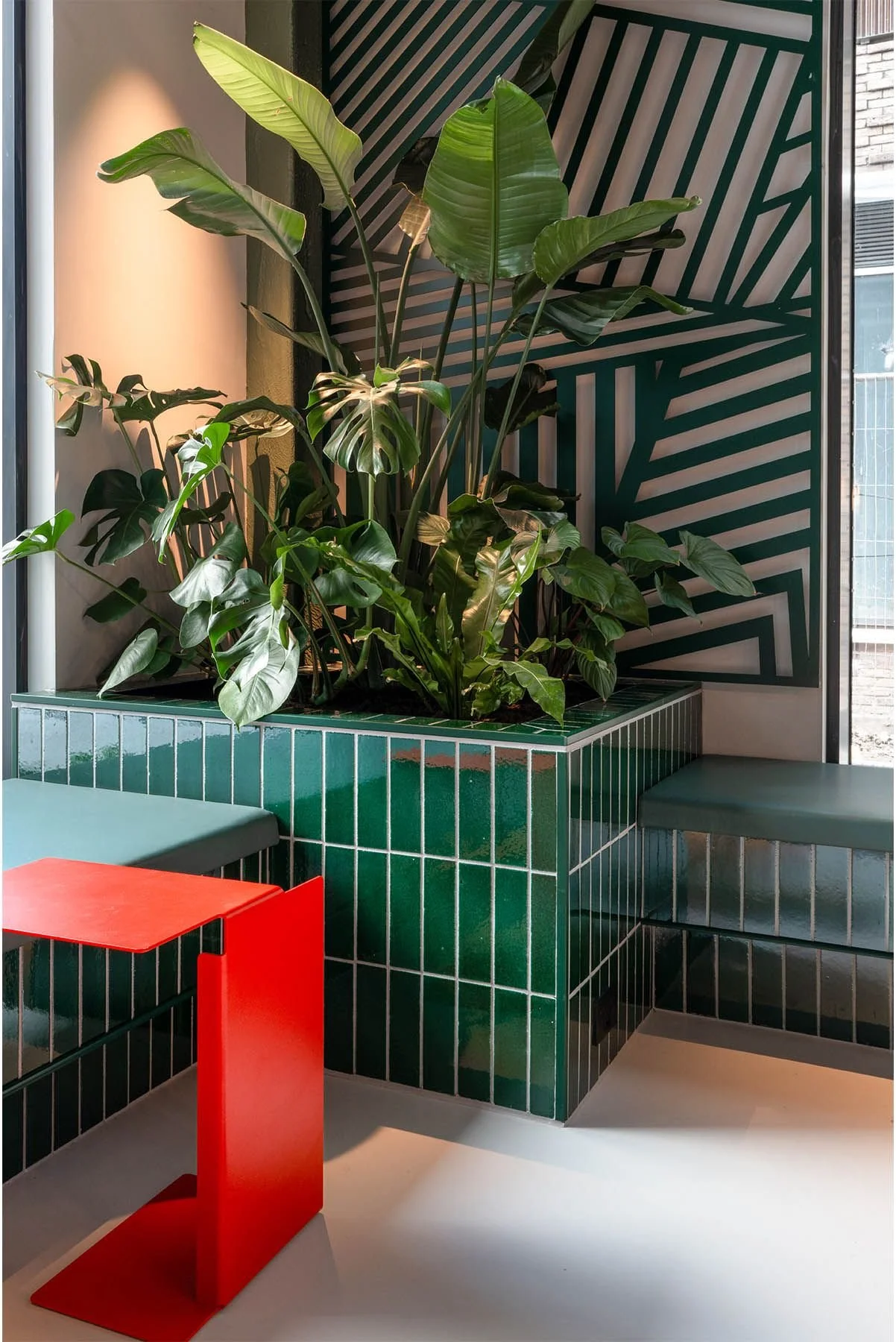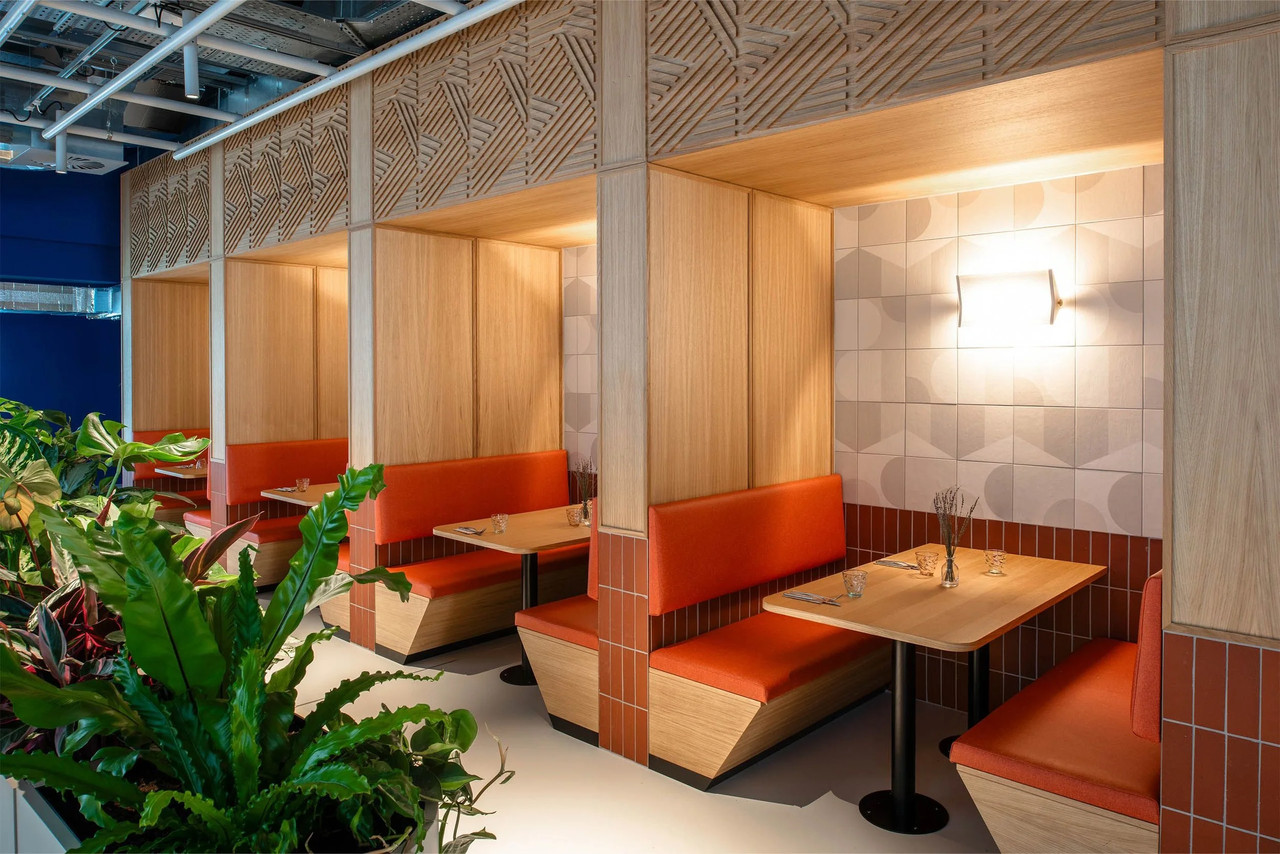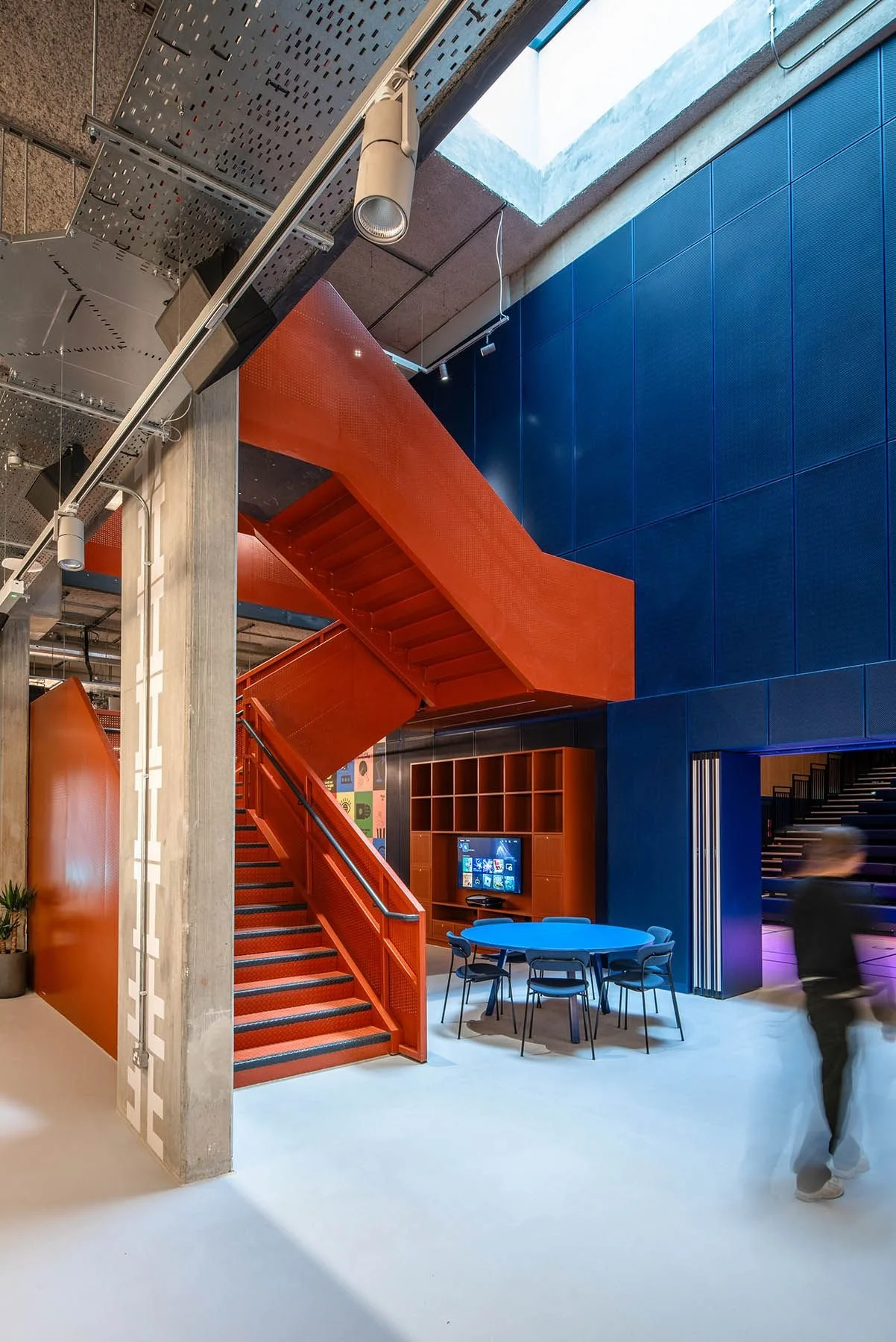 Inspired by Glasgow's industrial legacy and eclectic architectural landscape, we integrated materials such as concrete, sandstone, and steel, combining them with playful graphics and local cultural references. Glasgow's shipbuilding history is referenced through navy blue and red oxide steel sections and visible mechanical fixings, while a "razzle dazzle" camouflage pattern designed by a Glasgow School of Art alumnus in WWII adorns graphic screens and tiles.