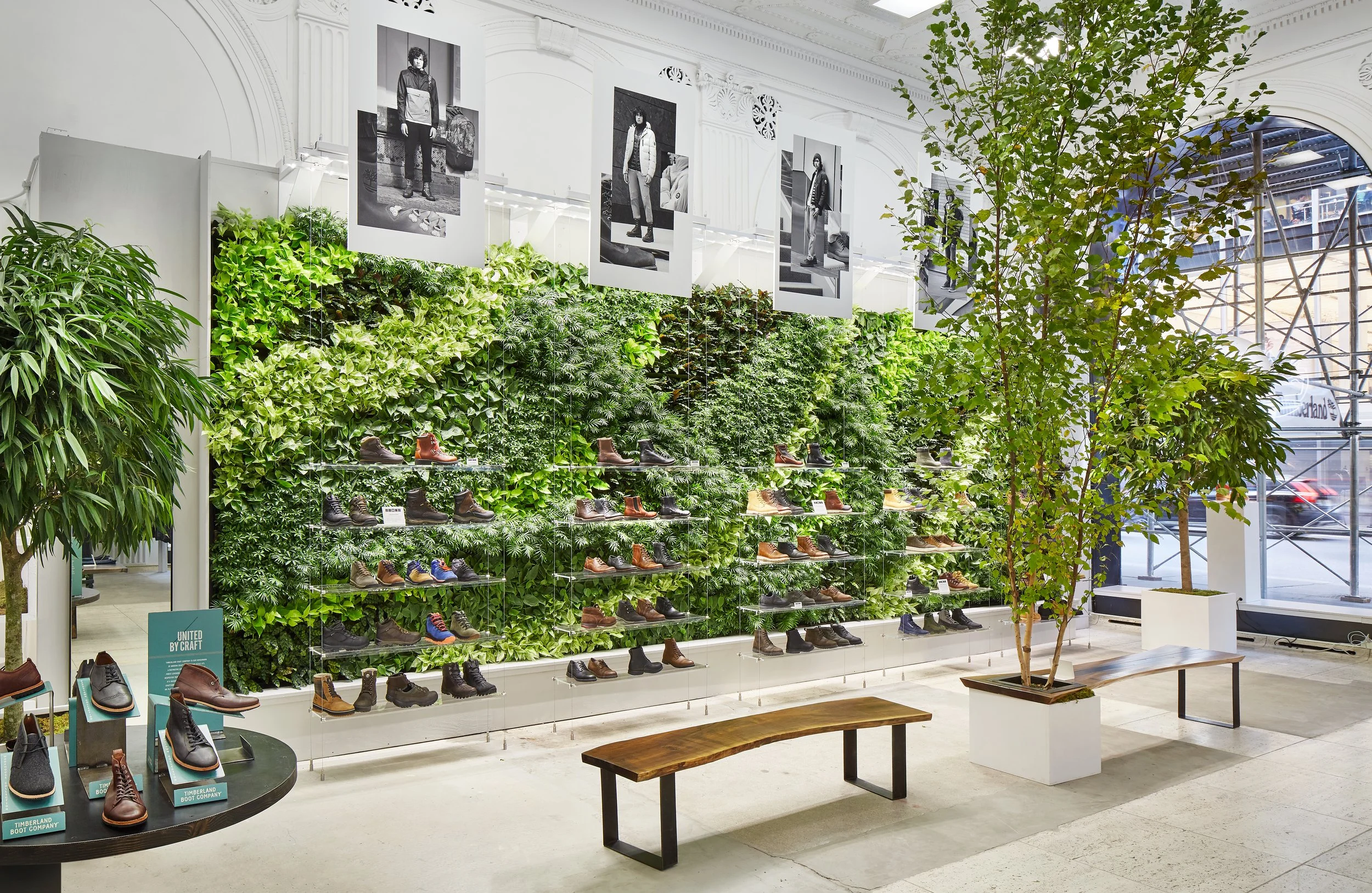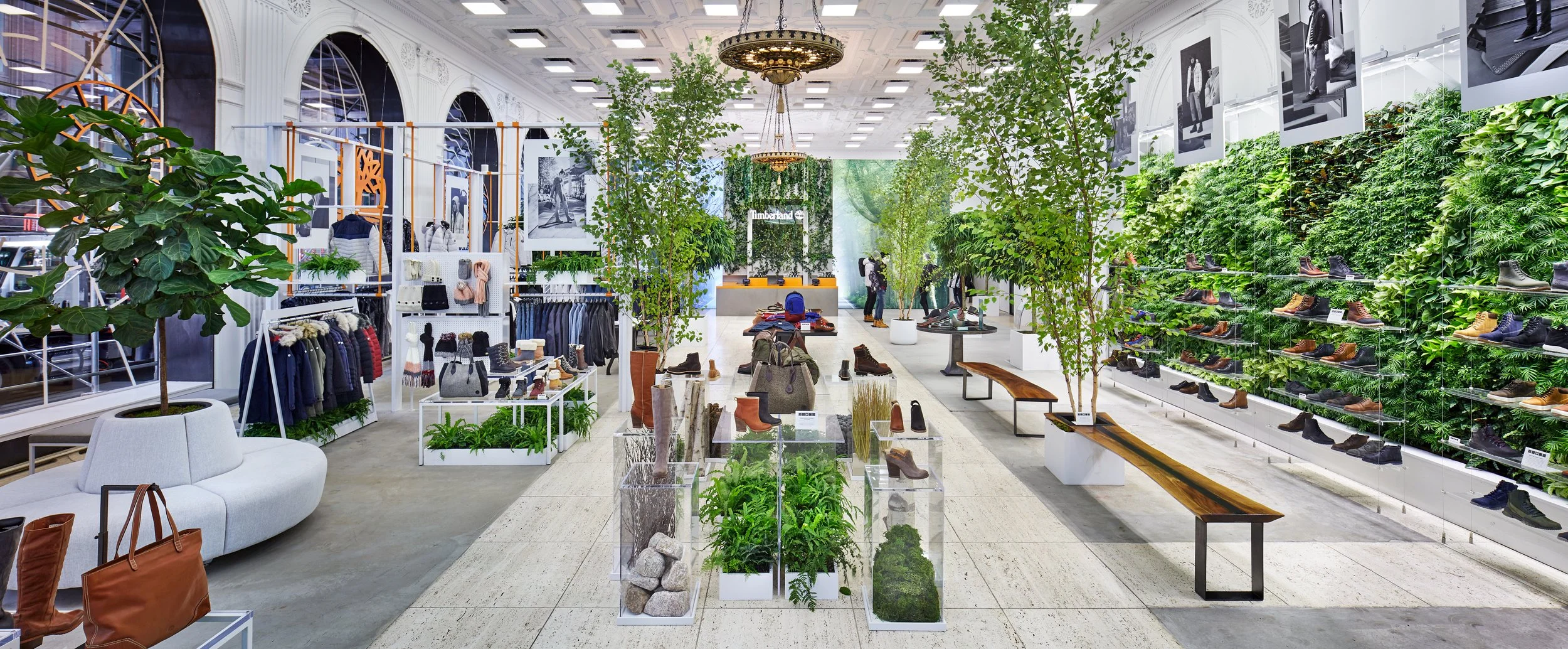 The Timberland Pop-up store on 5th Avenue was designed to immerse visitors in a lush, nature-inspired environment, reflecting the brand's commitment to sustainability and outdoor lifestyle. The store featured abundant greenery, including living plants and vertical gardens, creating a sense of being in a natural, forest-like setting within an urban space. This design choice was inspired by Timberland's ethos of environmental responsibility and its efforts to promote eco-friendly products.